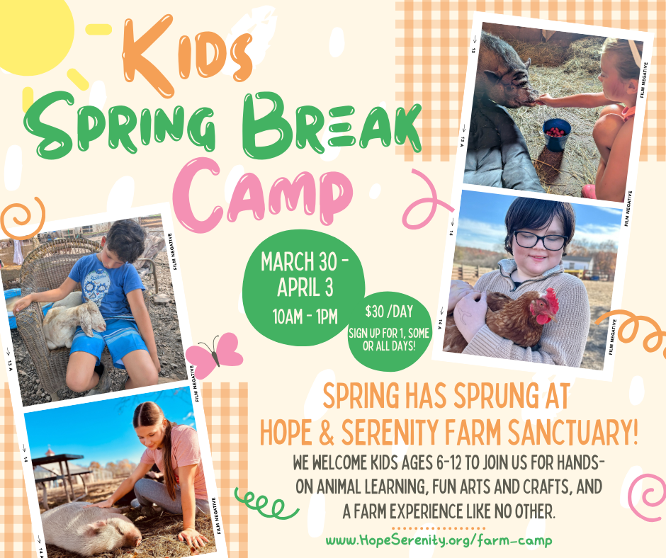 Back to All Events Spring Break Camp Monday, March 30, 2026 10:00 AM Friday, April 3, 2026 1:00 PM Hope & Serenity Farm Sanctuary 10445 Manley Road Nokesville, VA, 20181 United States (map) Google Calendar ICS Sign Up Here!