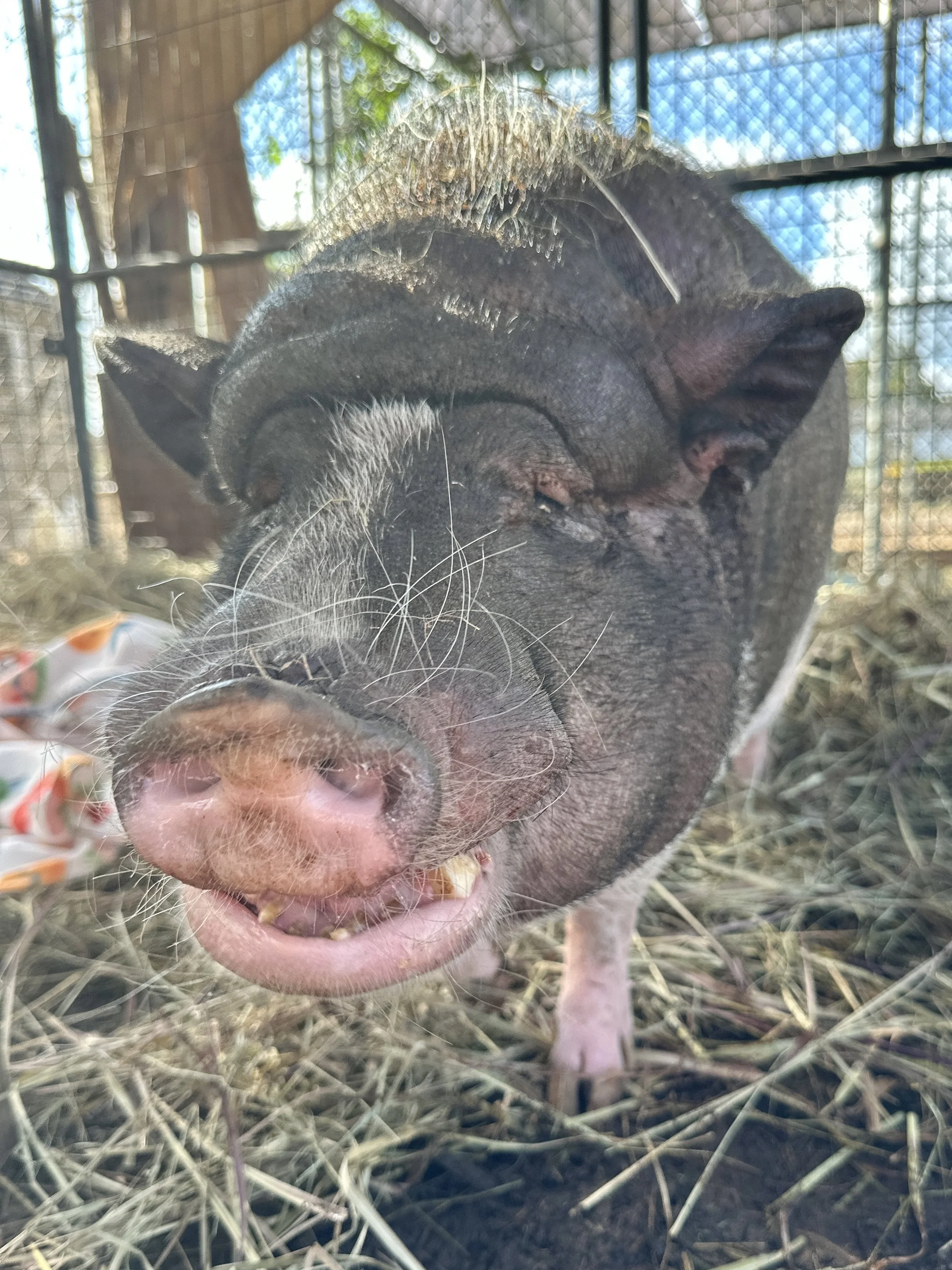 Porter II came to us in September 2025. He has been a house pig all his live, but his caretaker had left him. He is 8 years old. He is polite and takes treats gently. Our volunteers are spoiling him as he settles in.