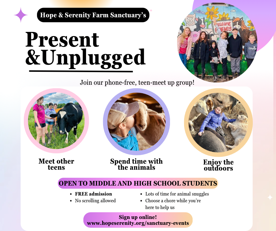 Back to All Events Present & Unplugged Teen Group Apr 3rd Friday, April 3, 2026 4:00 PM 6:00 PM Hope & Serenity Farm Sanctuary 10445 Manley Road Nokesville, VA, 20181 United States (map) Google Calendar ICS Reserve Your Spot!